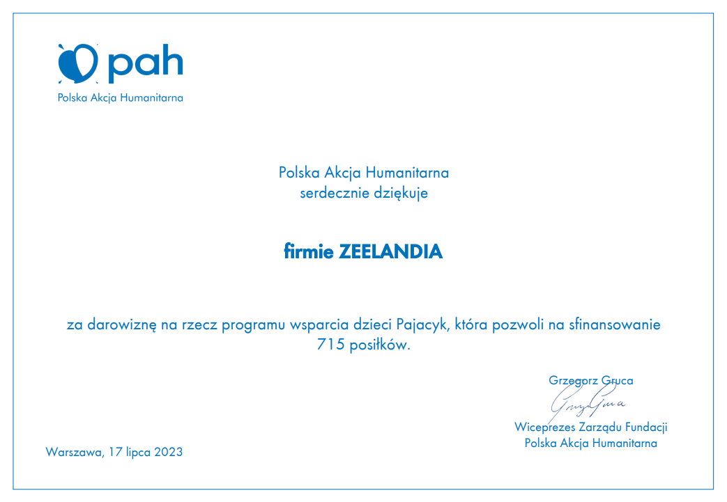 Zeelandia wspólnie ze swoimi Klientami dołączyła do ogólnopolskiej akcji organizowanej już od wielu lat przez Polską Akcję Humanitarną, której głównym celem jest zmniejszenie liczebności niedożywionych dzieci poprzez pomoc w ich dożywianiu i zakup obiadów szkolnych dla tych najuboższych.